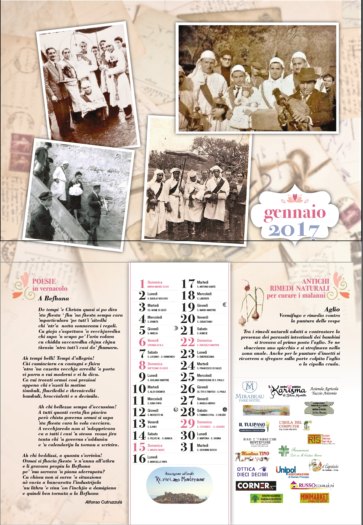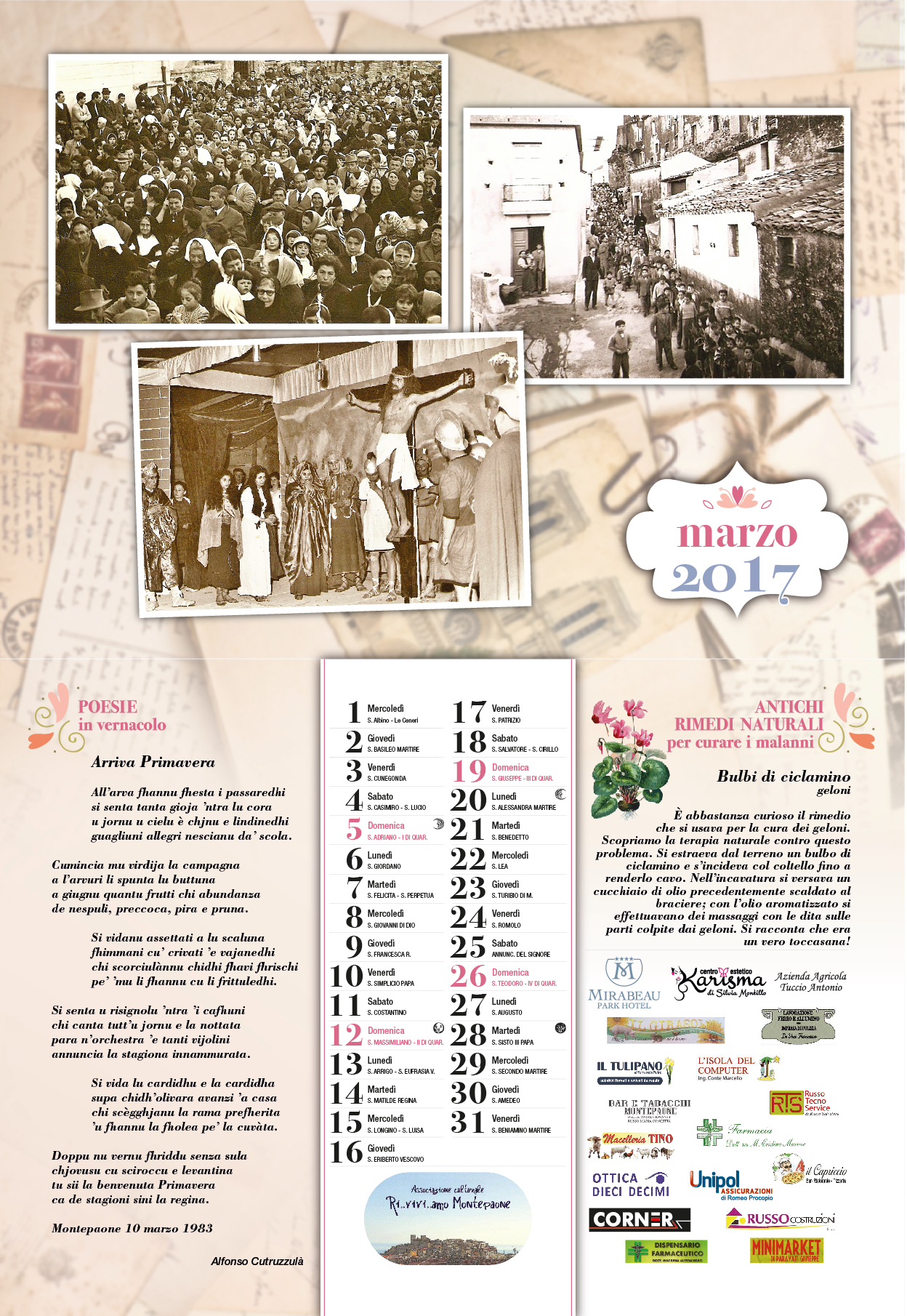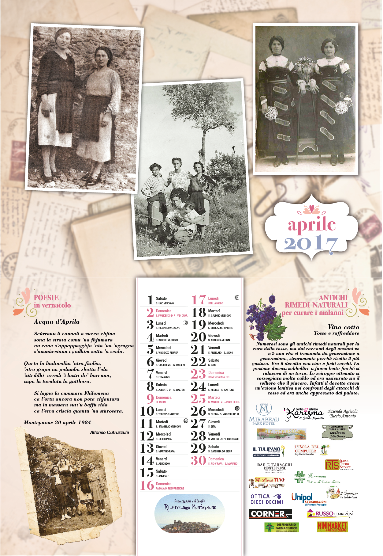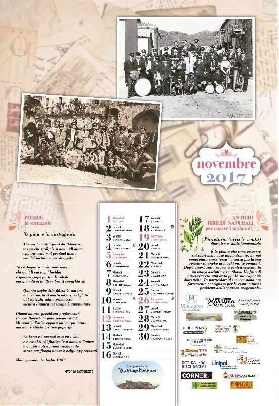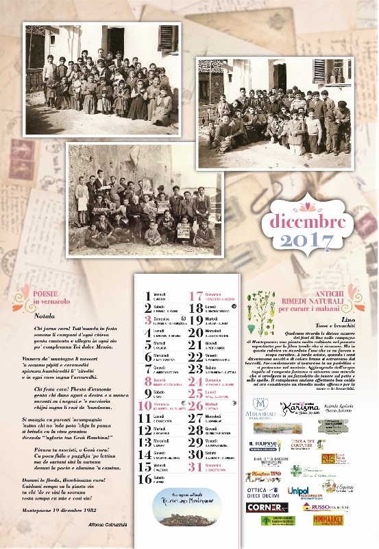 Continua il lavoro intrapreso con i precedenti calendari per ricostruire a poco a poco, attraverso la ricerca del passato, la storia e l’identità del nostro territorio. Seguitiamo a raccogliere le testimonianze che ci aiutano a conservare e a preservare la nostra cultura e tradizione.