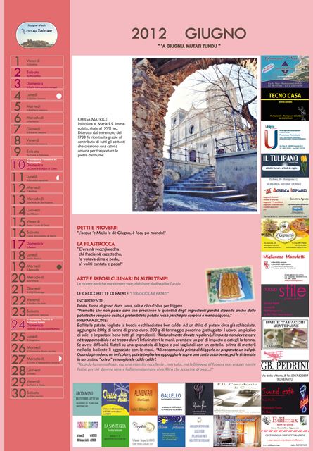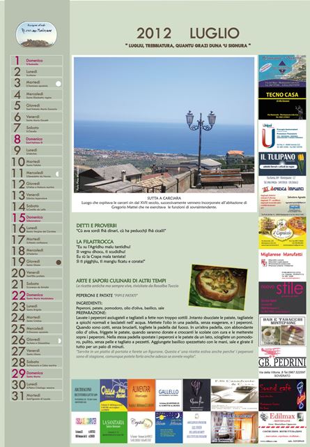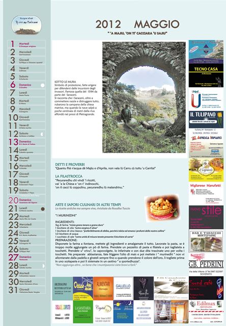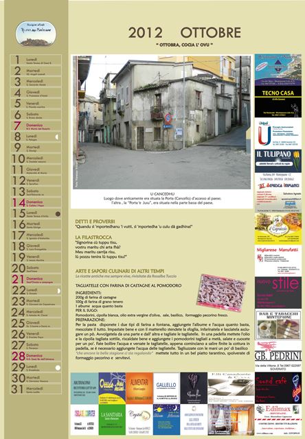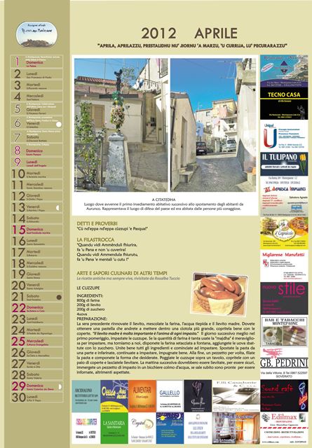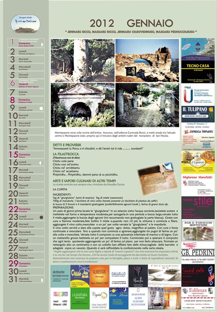 Ogni momento dell’anno viene rappresentato attraverso i proverbi e le ricette, legate queste ultime, ai prodotti tipici che offre la terra con l’evolvere delle stagioni. Un tuffo nel passato per un calendario tutto da leggere, frutto del lavoro di ricerca che si concretizza in una sorta di “passaggio di consegna” dagli anziani, alle ultime generazioni. Questo primo lavoro curato nei minimi particolari dà il via al progetto “Calendari da collezione”… perché ogni lavoro, rappresenta un piccolo tassello del racconto che l’Associazione ha inteso narrare.