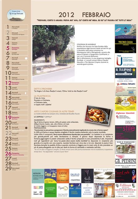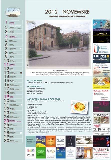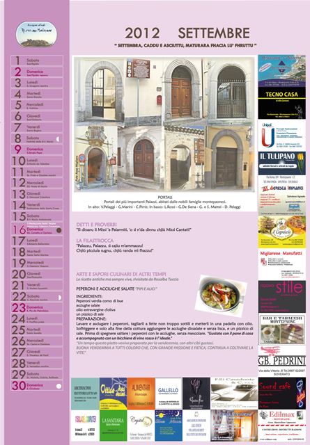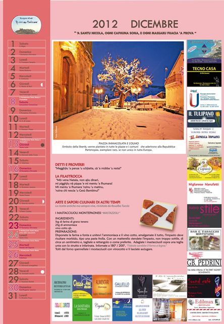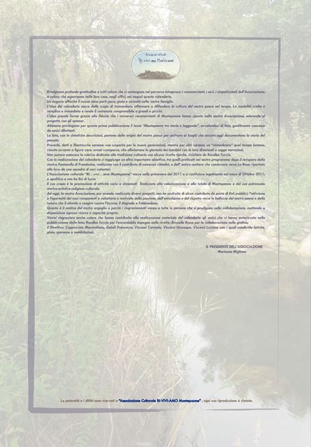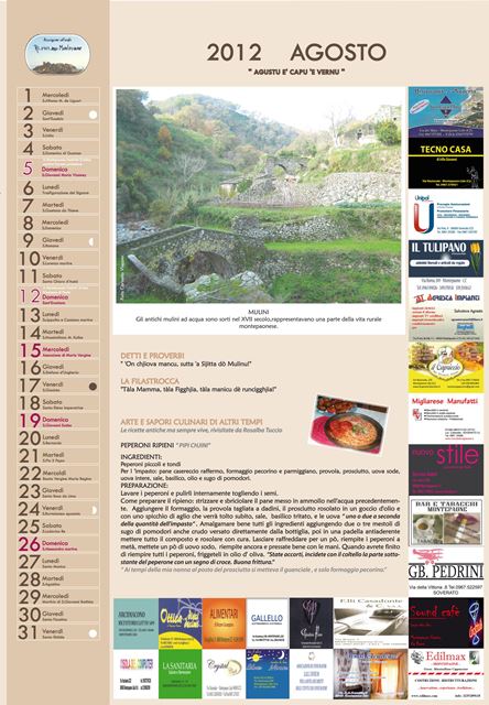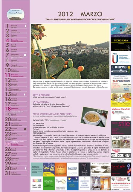 Il primo calendario curato dall’Associazione rappresenta una vera e propria miscellanea di detti e proverbi, ricette, filastrocche ed immagini inedite con l’obiettivo di raccontare mese dopo mese una minima parte di quell’immenso bagaglio di tradizioni che rimandano alla cultura ed alla identità del popolo montepaonese.