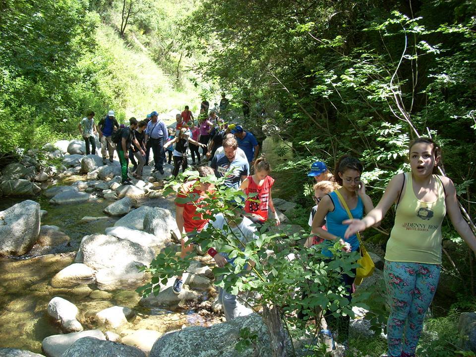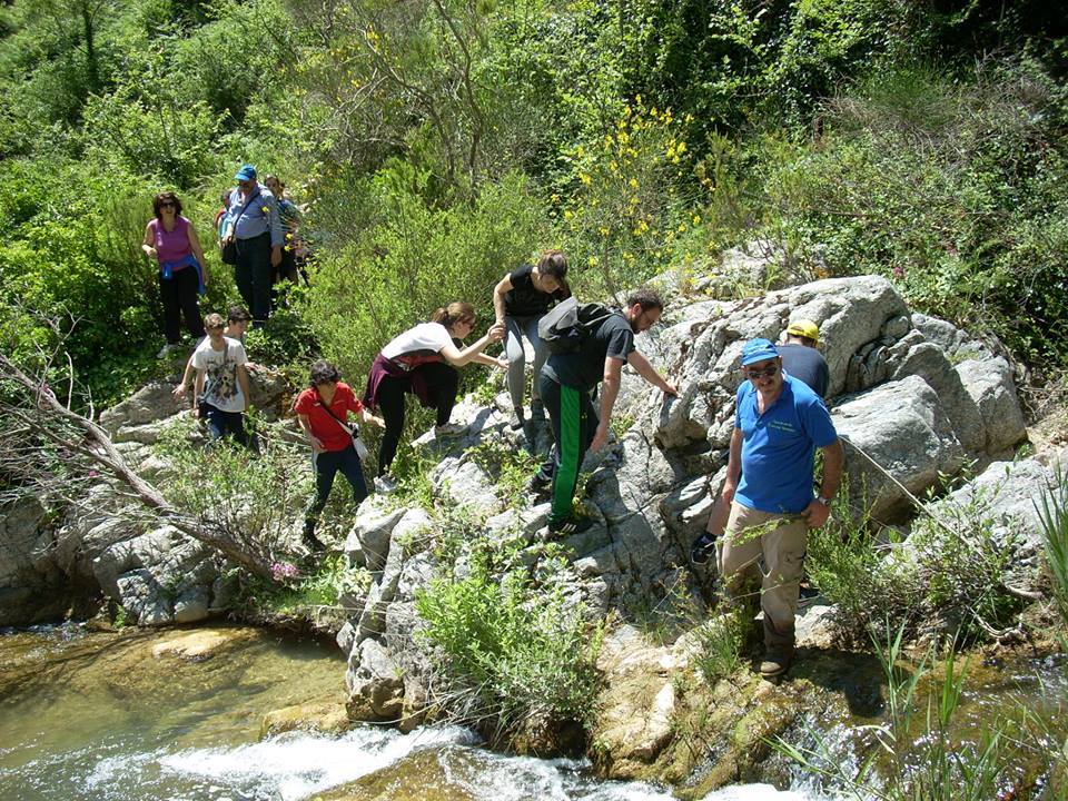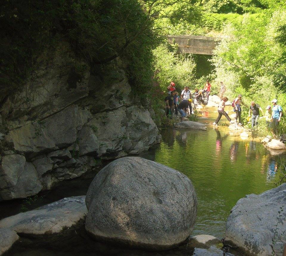 La sajitta che ancora è ben visibile, traccia il percorso sopra il fiume. Dopo aver visitato quello che resta degli antichi mulini ad acqua e aver fruito della narrazione della guida, sia sul funzionamento degli stessi che sugli aneddoti e i ricordi rimasti nella cultura orale popolare, ci sia avvia a guadare il fiume Grizzo. In realtà sarebbe più corretto utilizzare il termine torrente, in quanto come i torrenti è caratterizzato da un deflusso delle acque estremamente variabile. Abbondante in inverno e scarso o estremamente ridotto nel periodo primaverile/estivo. Guadarlo non è certo una passeggiata, ma il paesaggio naturalistico nel quale ci si ritrova immersi, ripaga ogni fatica. Le rocce, la macchia mediterranea, fatta di ginestre e mirti in fiore, di ombrosi alberi secolari avvolgono i sensi, non più abituati a un contatto così intimo con la natura. La fauna fa capolino: pesci d’acqua dolce, girini, farfalle colorate, insetti e qualche rettile impaurito, sembrano stupirsi della presenza dell’uomo. Una volta questi sentieri erano “mantenuti vivi” dalla gente del paese, che nel periodo estivo e primaverile era solita frequentarli per recarsi nei rispettivi orti o più semplicemente per trovare ristoro immergendosi nei gurnali (piscine naturali presenti lungo il sentiero).