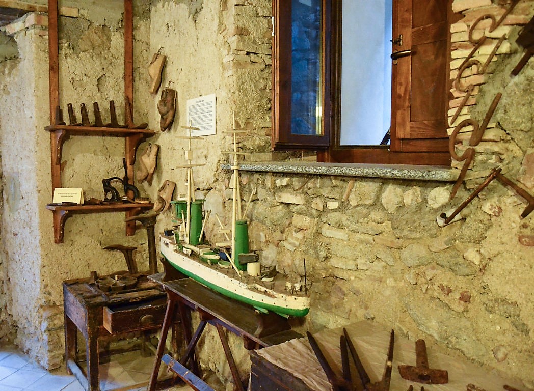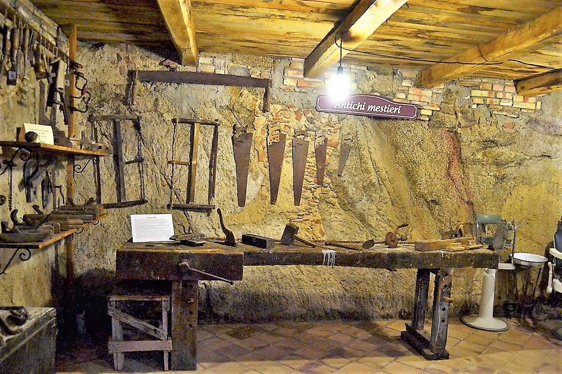 Una grande varietà di arnesi originali documentano la fiorente attività artigianale locale, dal calzolaio al fabbro, dal falegname al sarto, dallo stagnino alla tessitrice, dal crivaro al cupetaro. Rasoi, macchinette e persino la vecchia poltrona e il cavalluccio ricordano il vecchio salone del barbiere, un luogo dove gli uomini s’incontravano anche per conversare e socializzare.